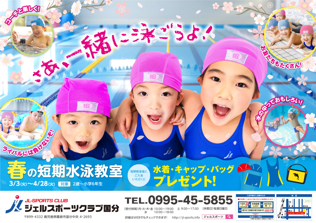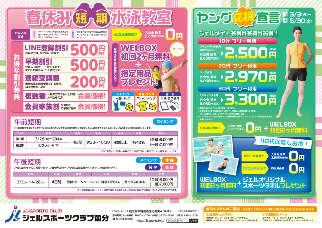ジェルスポーツクラブ 国分店のお知らせ一覧 ジェルスポーツクラブ国分 春の短期水泳教室のご案内 更新日 2026年02月18日 ジェルスポーツクラブ国分 2026年2–3月スケジュール訂正のお知らせ 更新日 2026年01月26日 営業時間変更のお知らせ 更新日 2025年09月02日 ジェルスポーツクラブ国分 英語教室定期コースのご案内 更新日 2021年02月26日 ジェルスポーツクラブ国分 英語教室体験会のご案内 更新日 2021年2月09日 ジェルスポーツクラブ国分 習字教室一部閉講のお知らせ 更新日 2020年07月31日 【重要】新型コロナウイルスに対する対応について 更新日 2020年02月28日 facebook ジェルスポーツクラブ 入会・体験のご案内 WELBOXのご案内 企業紹介 プライバシーポリシー サイトマップ facebook ジェルスポーツクラブ